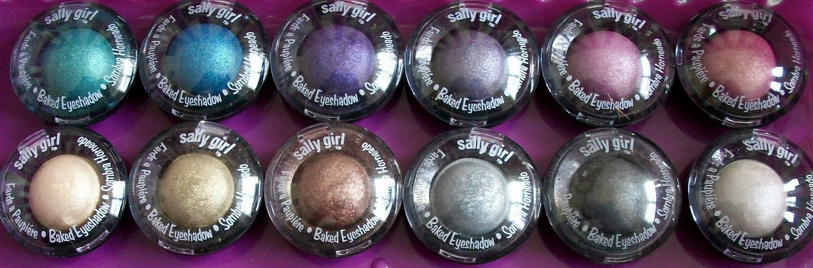 The regular Sally Girl eyeshadow is also really great. I first used those. There are 48 colors available. I have a handful of these, and most of them are pretty well pigmented, too. There are matte, glitter, and frost/shimmery types in a variety of colors. These are the same price as the baked eyeshadow. What's also cool about these is that they connect together as well.
